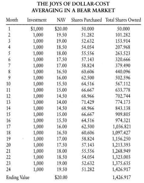 Benefits of DCA1. It's Smart. Buying more units when prices are low and fewer units when prices are high is a good way to reduce the average cost per unit.2. It's Automatic. With an Electronic Fund Transfer deposits occur systematically from your checking account into your mutual fund. You can do so for as little as $50/month. However, you are always in control - you can increase, decrease, pause, stop and re-start the plan at anytime.3. It's Disciplined. Dollar cost averaging takes the emotion out of investing. You can stop asking yourself, "When's the right time to buy?" It eliminates the issue of market timing. As a result, an investor's returns will be determined more by the overall trend in a given fund as opposed to the investor's specific entry price. In addition, it helps investors reduce their cost basis on securities that decline in value.