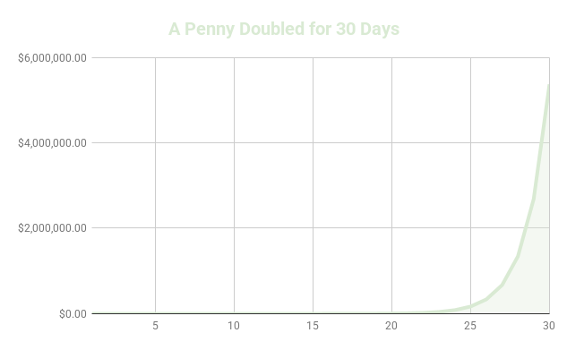 Doubling a penny 30 times = $5,368,709! (It actually only take 28 days to surpass $1M.)