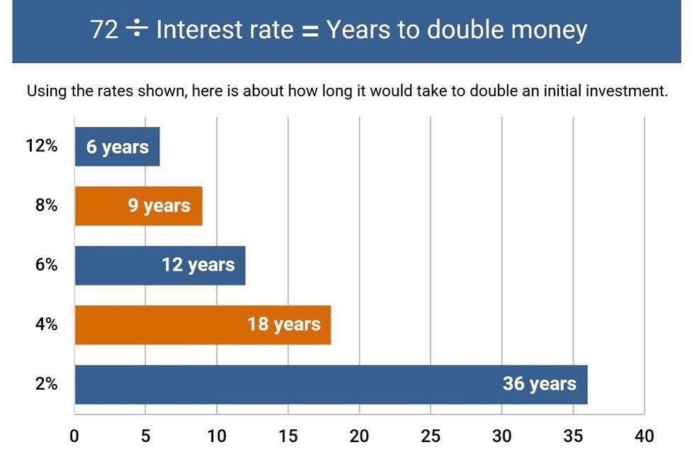 The math behind it works because doubling is linked to how percentages compound over time. The exact calculation involves logarithms, which are used in higher-level math to solve problems related to exponential growth. But the Rule of 72 skips all the complicated calculations by relying on a close approximation that works well for most realistic growth rates.It’s not perfect — its accuracy wobbles with very high or very low interest rates — but for rates between 4% and 15%, it’s remarkably accurate. Economists trace its origins to 15th-century merchants who marveled at the power of compounding long before financial calculators existed.The correct rule should be:69.3 / Interest Rate = Years to Double MoneyBut we use 72 instead of 69.3 because it has a lot of divisors so it can be easier to do mentally. For example, 72 divides cleanly into 1, 2, 3, 4, 6, 8, 9 and 12, allowing for a quick and simple division problem instead of using a compound interest calculator.