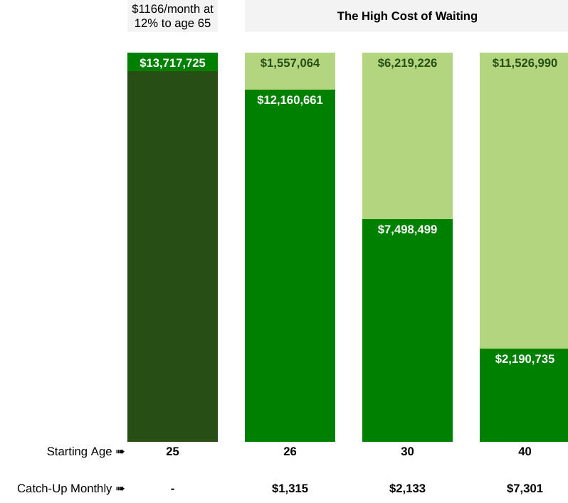 In the above chart, we notice the following:1. Fully-funding two IRAs for a married couple from age 25 to 65 (40 years of saving) and earning an average of 12% rate-of-return, will build them a $13M nest-egg.2. By waiting just one year to start their IRAs (39 years of saving) it costs them $1.5M!3. By waiting five years to start their IRAs (35 years of saving) it costs them $6.2M!4. By waiting 15 years to start their IRAs (25 years of saving) it costs them $11.5M!At the bottom of chart you can see the amount of extra monthly contributions it would take to catch-up to the original value. Scary.Example 2: When is $21k > $90k?