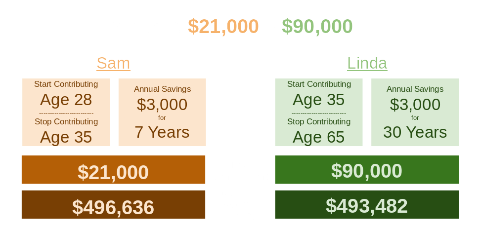 Let's compare Sam and Linda, two 28-year-olds contemplating saving for retirement in a long-term equity mutual fund earning an average of 10%:1. Sam begin investing immediately and saves $500 per month for seven years. Then he stops contributing due to family and other financial obligations. However, he doesn't withdraw any money and lets it compound until age 65 and ends-up with $496,636.2. Linda, due to not having extra cash, decided to delay investing for seven years until she is 35. However, once she starts contributing she doesn't stop and continues until she is 65. She ends-up with $493,482.Sam contributed $21,000 and accumulated $496,636. Linda contributed $90,000 and accumulated $493,482.This demonstrates both the power of starting early, and the high cost of waiting.